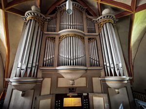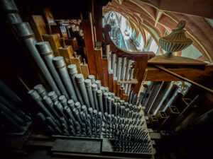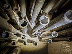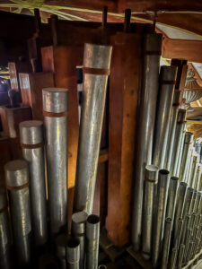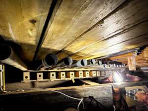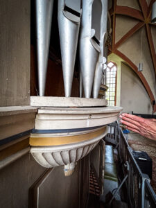Die Schäden in Bildern Ersatz der Prospektpfeifen durch Pfeifen aus Zink: „Fehlende Pfeifen des Registers 16HolzwurmbefallFalsch gestimmte PfeifenVerschmutzte PfeifenSchäden im RahmenErsatzpfeifenFehlende Pfeifen